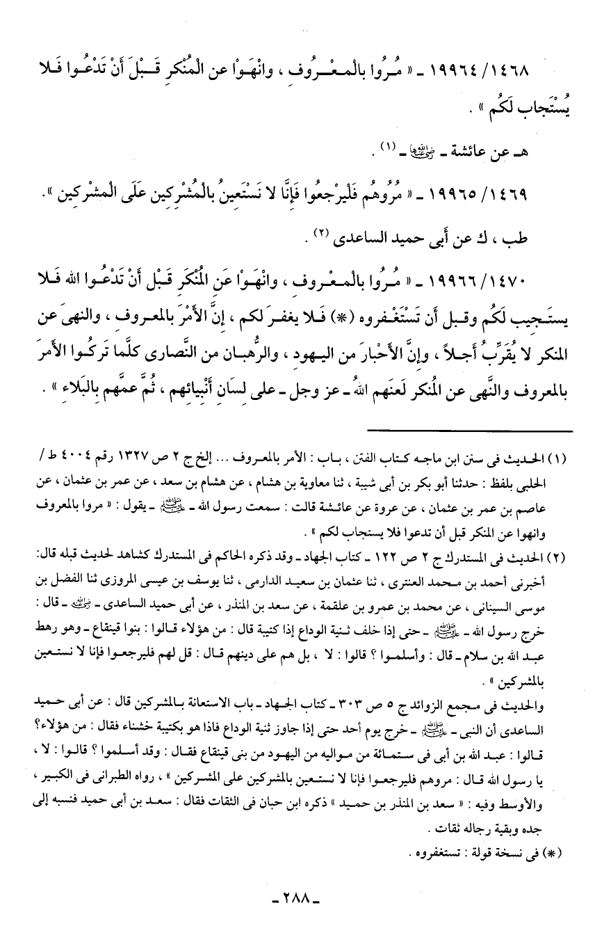 (¬1) الحديث في سنن ابن ماجه كتاب الفتن، باب: الأمر بالمعروف ... إلخ ج 2 ص 1327 رقم 4004 ط / الحلبى بلفظ: حدثنا أبو بكر بن أبي شيبة، ثنا معاوية بن هشام، عن هشام بن سعد، عن عمر بن عثمان، عن عاصم بن عمر بن عثمان، عن عروة عن عائشة قالت: سمعت رسول الله - صلى الله عليه وسلم - يقول: "مروا بالعروف وانهوا عن المنكر قبل أن تدعوا فلا يستجاب لكم".