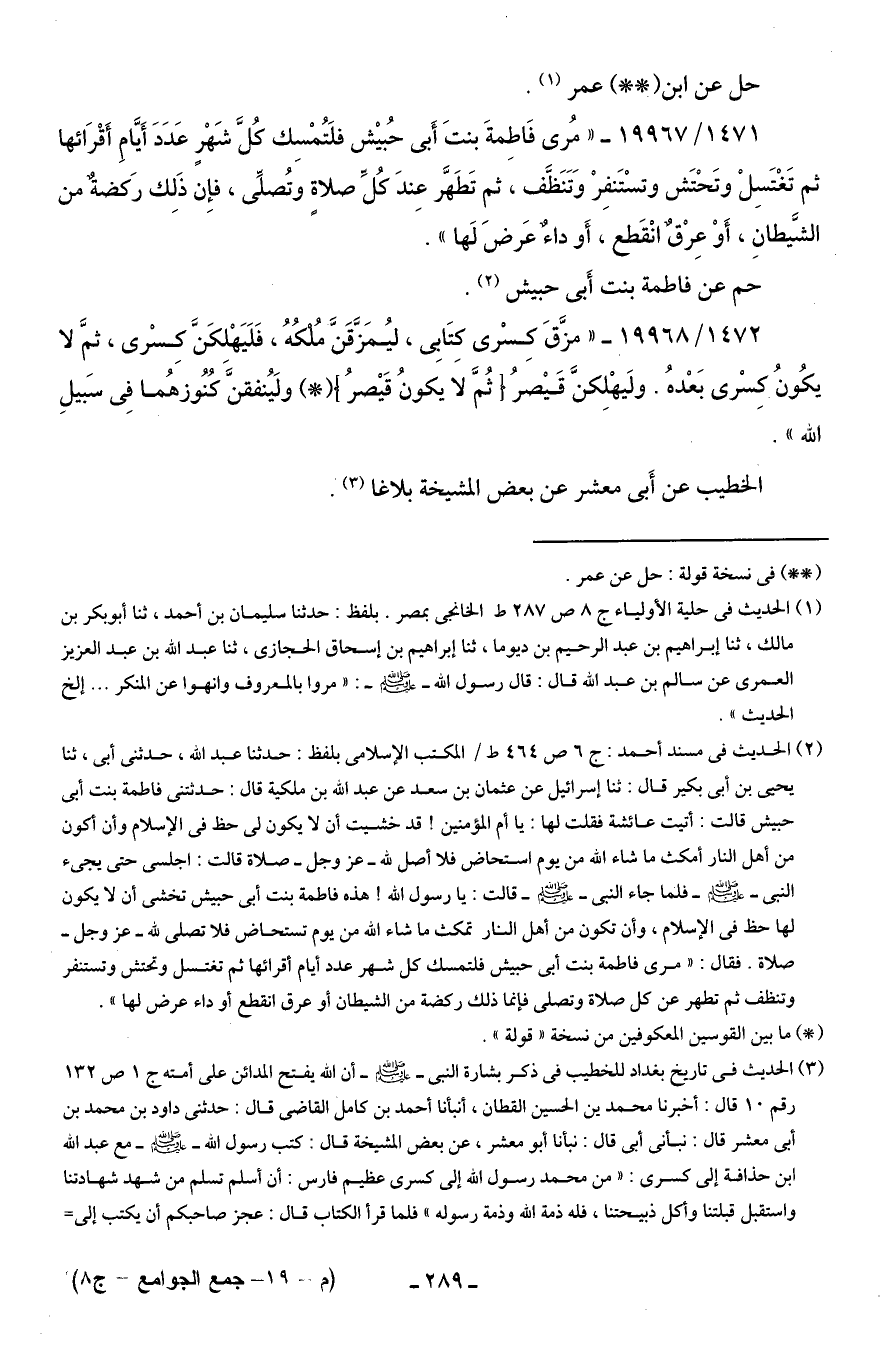 1471/ 19967 - "مُرى فَاطِمةَ بنتَ أَبى حُبيش فلَتُمْسِك كُلَّ شَهْرٍ عَدَدَ أَيَّامِ أَقْرَائها ثم تَغْتَسِلْ وتَحْتَش وتسْتَنفِرْ وَتَنَظَّف، ثم تَطَهَّر عِندَ كُلِّ صلاة وتُصلِّى، فإِن ذَلِك رَكضةٌ من الشَّيطانِ، أَوْ عِرْقٌ انْقَطع، أَو داءٌ عَرضَ لَها".
