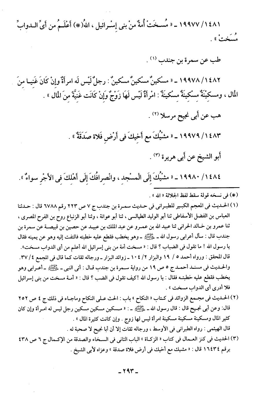 (¬1) الحديث في المعجم الكبير للطبرانى في حديث سمرة بن جندب ج 7 ص 223 رقم 6788 قال: حدثنا العباس بن الفضل الأسفاطى ثنا أبو الوليد الطيالسى، ثنا أبو عوانة، وثنا أبو الزنباع روح بن الفرح المصري، ثنا عمرو بن خالد الحراني ثنا عبيد الله بن عمرو عن عبد الملك بن عبيد عن حصين بن قبيصة عن سمرة بن جندب قال: سأل أعرابى رسول الله - صلى الله عليه وسلم - وهو يخطب فقطع عليه خطبته فالتفت إليه وهو عن يمينه فقال يا رسول الله! ما تقول في الضباب؟ قال: "مسخت أمة من بنى إسرائيل الله أعلم من أي الدواب مسخت".