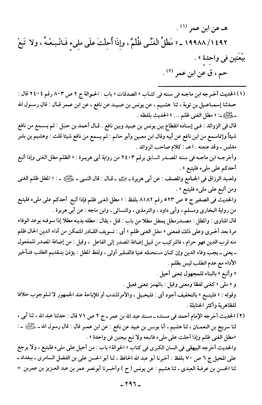 1492/ 19988 - "مَطلُ الغنِّي ظُلمٌ، وإذَا أُحِلتَ علَى ملِئٍ فَاتْبعْهُ، ولا تَبعْ بيعَتين في واحِدةٍ".