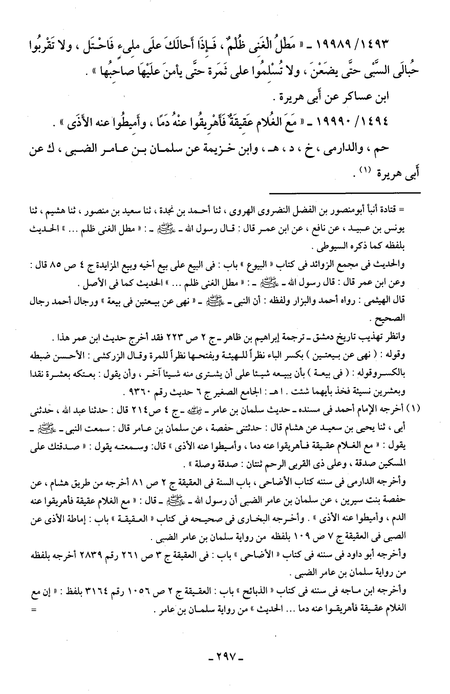 1494/ 19990 - "مَعَ الغُلام عَقِيقَة فَأهْرِيقُوا عنْهُ دَمًا، وأَمِيطُوا عنه الأَذَى".