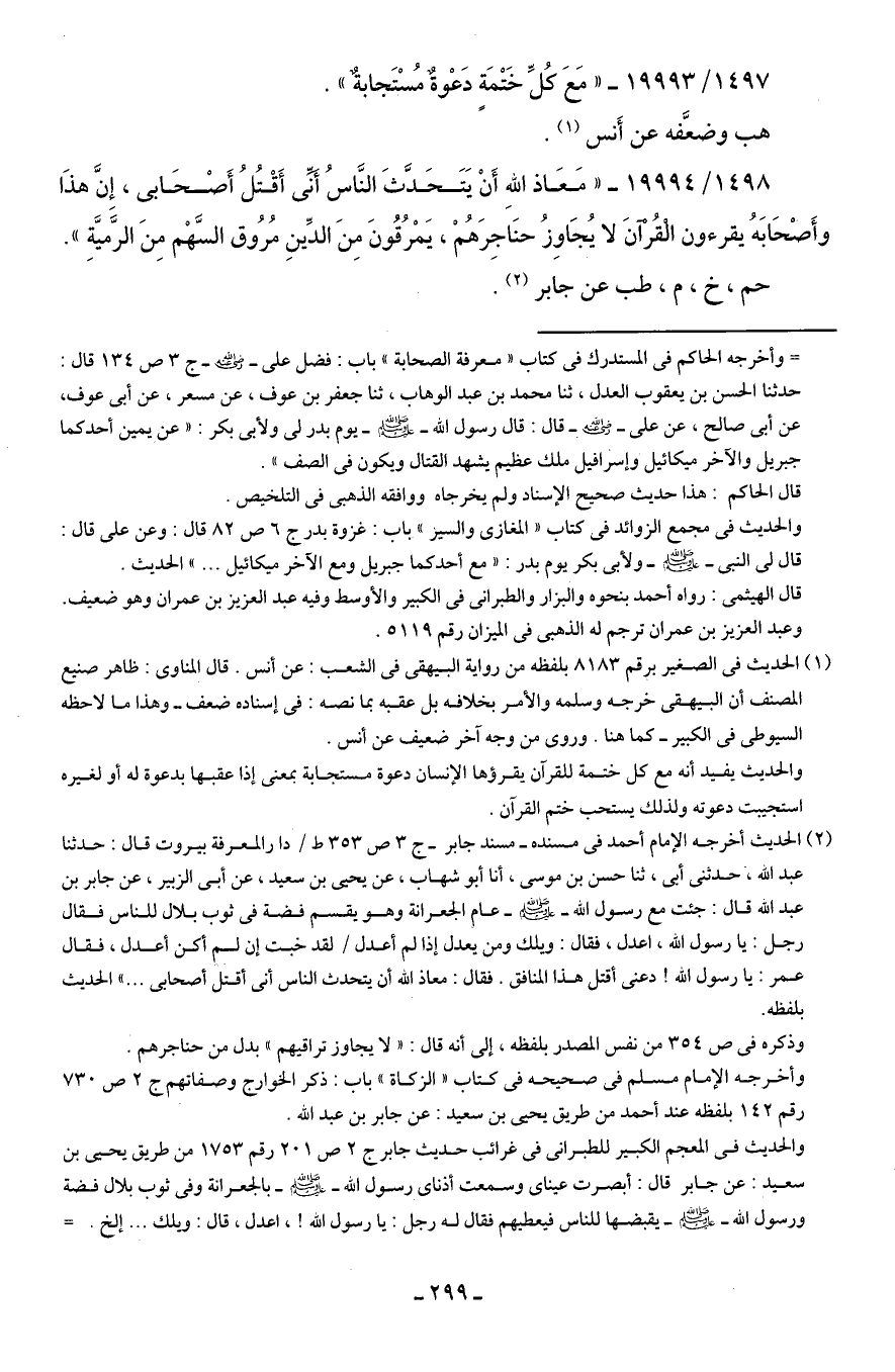 (¬2) الحديث أخرجه الإمام أحمد في مسنده- مسند جابر- ج 3 ص 353 ط / دار المعرفة بيروت قال: حدثنا عبد الله، حدثني أبي، ثنا حسن بن موسى، أنا أبو شهاب، عن يحيى بن سعيد، عن أبي الزبير، عن جابر بن عبد الله قال: جئت مع رسول الله - صلى الله عليه وسلم - عام الجعرانة وهو يقسم فضة في ثوب بلال للناس فقال رجل: يا رسول الله، اعدل، فقال: ويلك ومن يعدل إذا لم أعدل / لقد خبت إن لم أكن أعدل، فقال عمر: يا رسول الله! دعنى أقتل هذا المنافق. فقال: معاذ الله أن يتحدث الناس أنى أقتل أصحابى ... " الحديث بلفظه.