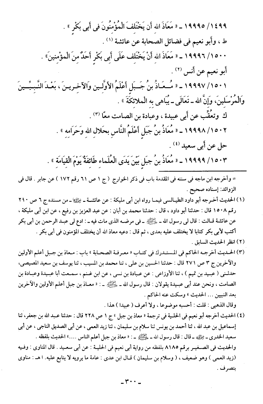 1501/ 19997 - "مُعَاذُ بن جَبَلٍ أَعْلَمُ الأوَلِين وَالآخِرينَ، بَعْدَ النَّبِيِّينَ وَالمُرْسَلِينَ، وَإِنَّ الله -تَعَالى- يُبَاهى بِهِ الملائِكَةَ".