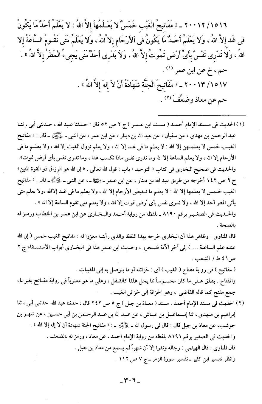(¬1) الحديث في مسند الإمام أحمد (مسند ابن عمر) ج 2 ص 52 قال: حدثنا عبد الله، حدثني أبي، ثنا عبد الرحمن بن مهدى، عن سفيان، عن عبد الله بن دينار، عن ابن عمر، عن النبي - صلى الله عليه وسلم - قال: "مفاتيح الغيب خمس لا يعلمهن إلا الله: لا يعلم ما في غد إلا الله، ولا يعلم نزول الغيث إلا الله، ولا يعلم ما في الأرحام إلا الله، ولا يعلم الساعة إلا الله وما تدرى نفس ماذا تكسب غدا، وما تدرى نفس بأي أرض تموت".