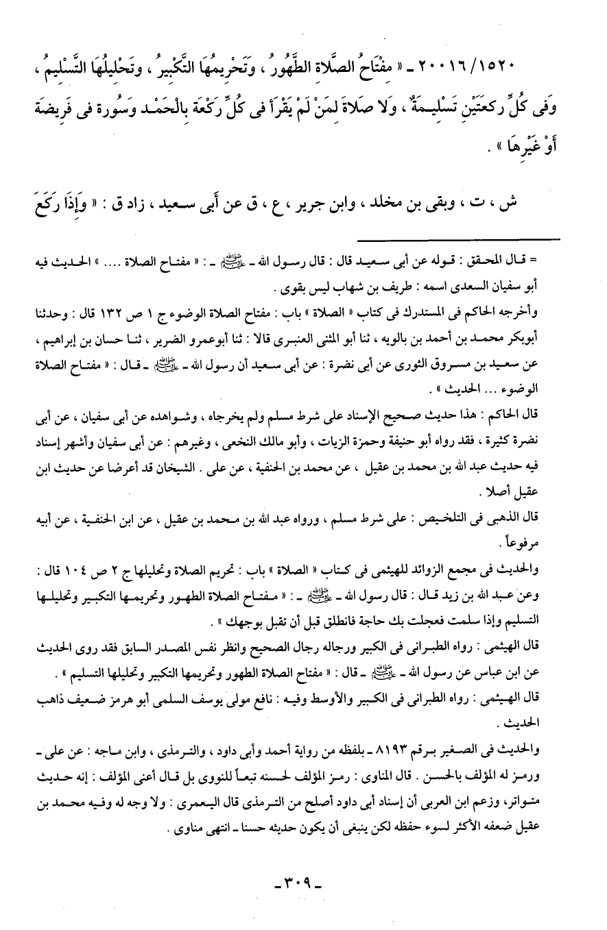 = قال المحقق: قوله عن أبي سعيد قال: قال رسول الله - صلى الله عليه وسلم -: "مفتاح الصلاة .... " الحديث فيه أبو سفيان السعدى اسمه: طريف بن شهاب ليس بقوى.