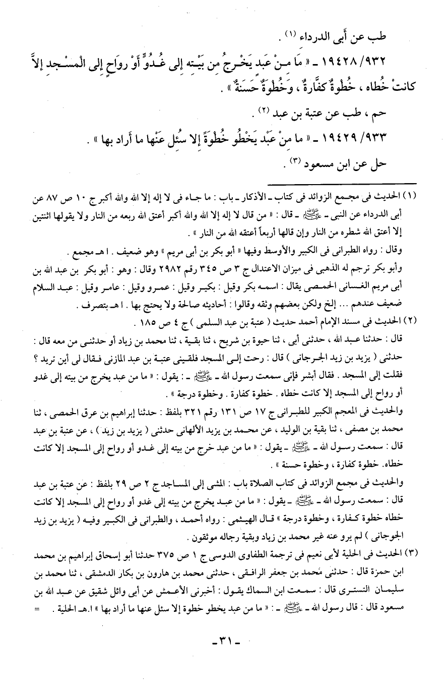 932/ 19428 - "مَا منْ عَبدٍ يَخْرجُ مِن بَيتِه إِلي غُدُوٍّ أَوْ روَاحٍ إِلي الْمسْجدِ إلَّا كانتْ خُطاه، خُطوةٌ كفَّارةٌ، وخُطْوَةٌ حَسَنةٌ".