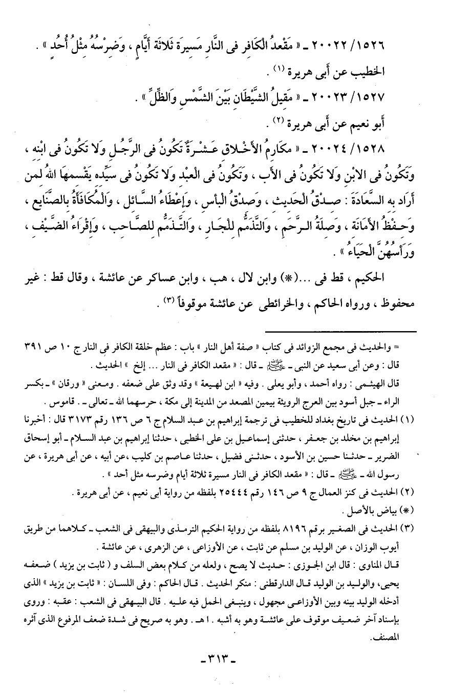 1526/ 20022 - "مَقْعدُ الْكَافِر في النَّارِ مَسِيرَة ثَلاثَة أَيَّامٍ، وَضِرْسُهُ مِثْلُ أُحُدٍ".