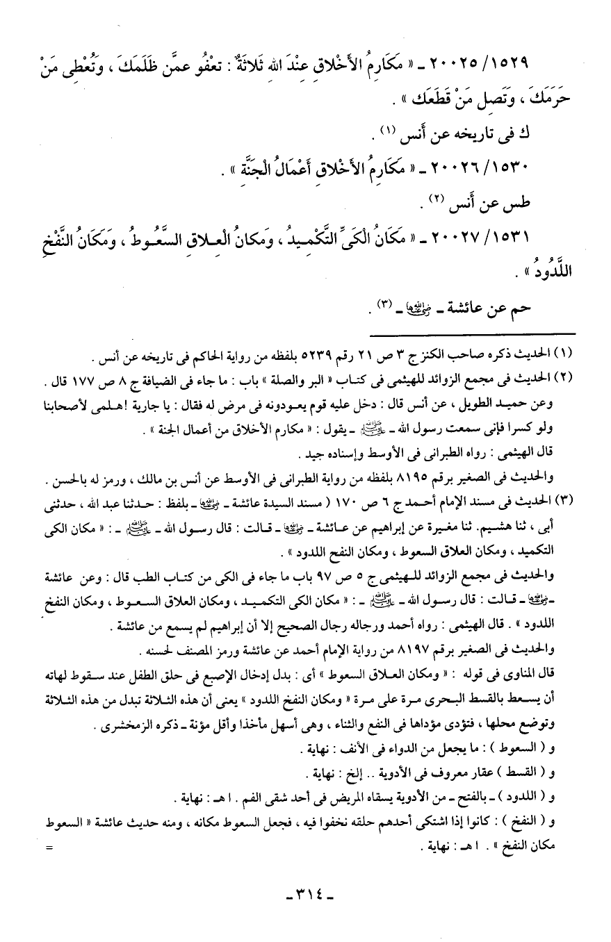 (¬2) الحديث في مجمع الزوائد للهيثمى في كتاب "البر والصلة" باب: ما جاء في الضيافة ج 8 ص 177 قال. وعن حميد الطويل، عن أنس قال: دخل عليه قوم يعودونه في مرض له فقال: يا جارية! هلمى لأصحابنا ولو كسرا فإني سمعت رسول الله - صلى الله عليه وسلم - يقول: "مكارم الأخلاق من أعمال الجنة".
