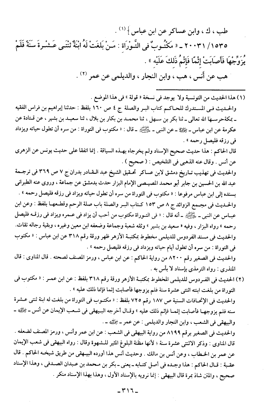 1535/ 20031 - "مَكْتُوبٌ في التَّوْرَاةِ: مَنْ بَلغَتْ لَهُ ابْنَةٌ ثنْتَى عَشْرةَ سَنَةً فَلَمْ يُزَوِّجْهَا فَأَصَابَتْ إِثْمًا فَإِثْمُ ذَلِكَ عَلَيهِ".