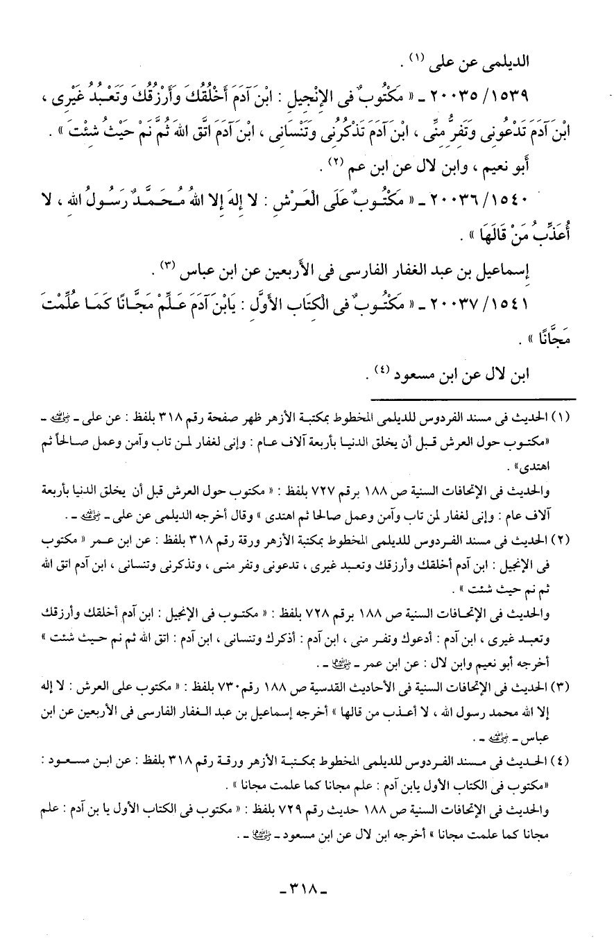 (¬2) الحديث في مسند الفردوس للديلمى المخطوط بمكتبة الأزهر ورقة رقم 318 بلفظ: عن ابن عمر "مكتوب في الإنجيل: ابن آدم أخلقك وأرزقك وتعبد غيرى، تدعونى وتفر منى، وتذكرنى وتنسانى، ابن آدم اتق الله ثم نم حيث شئت".