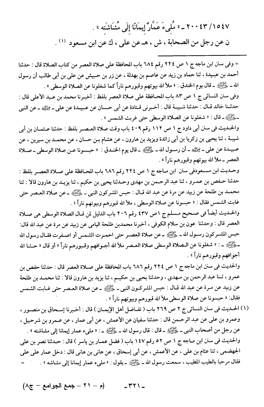 = وفي سنن ابن ماجه ج 1 ص 224 رقم 684 باب المحافظة على صلاة العصر من كتاب الصلاة قال: حدثنا أحمد بن عبيدة، ثنا حماد بن زيد عن عاصم بن بهدلة، عن زر بن حبيش عن علي بن أبي طالب أن رسول الله - صلى الله عليه وسلم - قال يوم الخندق: "ملأ الله بيوتهم وقبورهم نارًا كما شغلونا عن الصلاة الوسطى".