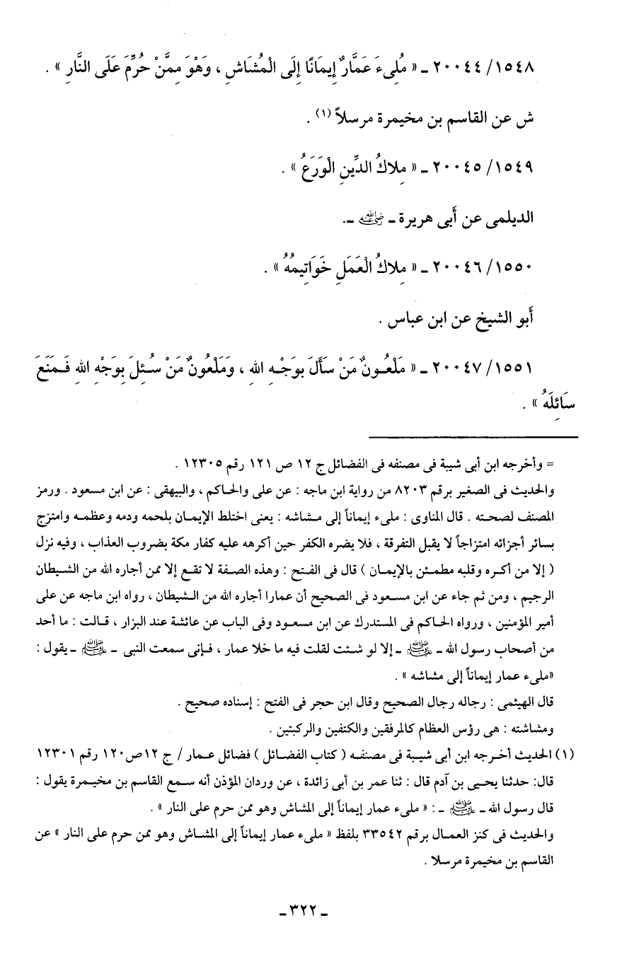 1548/ 20044 - "مُلِئَ عَمَّارٌ إِيمَانًا إِلَى الْمُشَاشِ، وَهْوَ مِمَّنْ حُرِّمَ عَلَى النَّارِ".