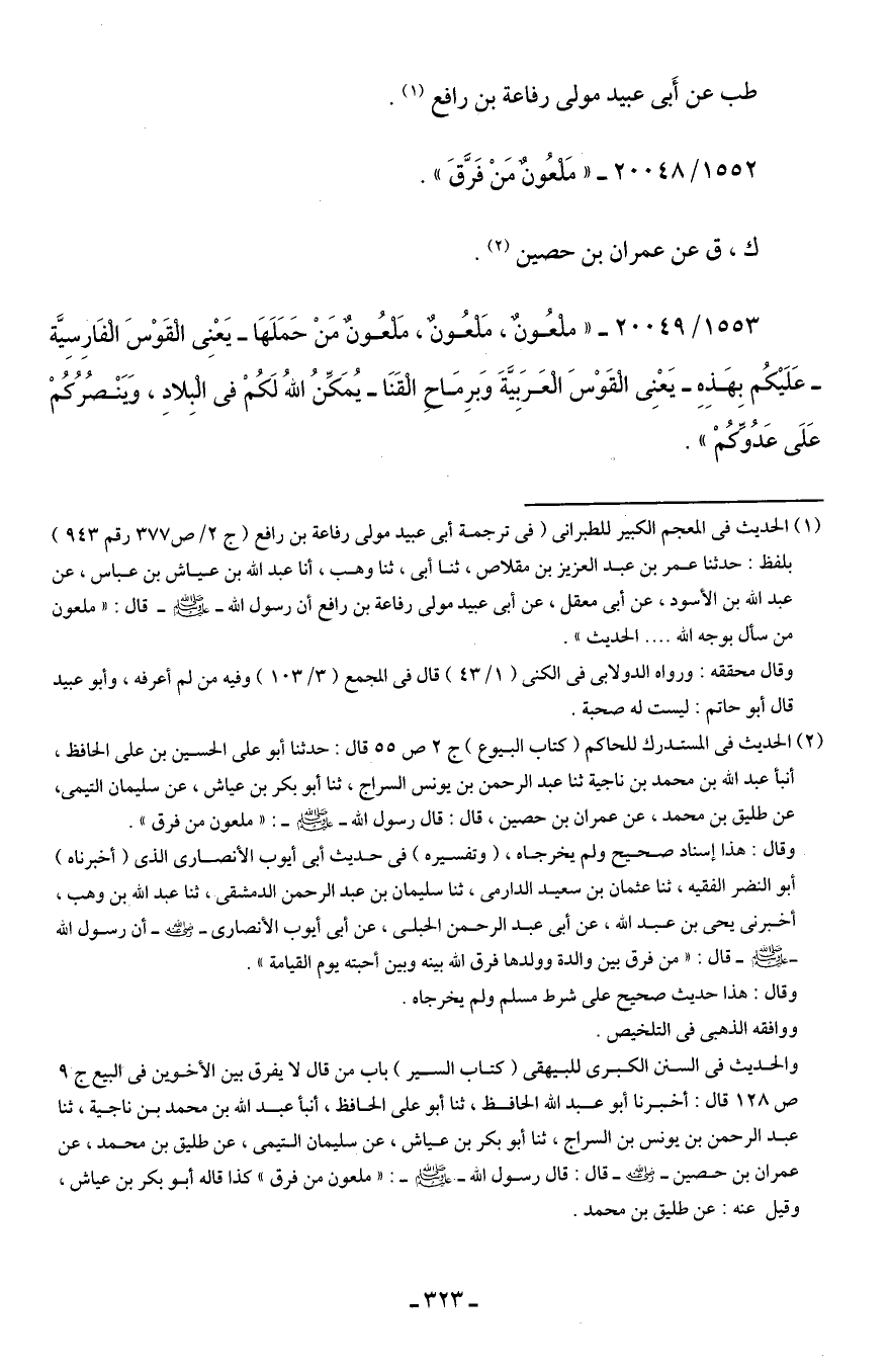 1553/ 20049 - "ملْعُونٌ، مَلْعُونٌ، مَلْعُونٌ مَنْ حَمَلَهَا -يَعْنِي الْقَوْسَ الْفَارِسِيَّة- عَلَيكُم بِهَذِهِ يَعْنِي الْقَوْسَ الْعَرَبِيَّةَ وَبرِمَاحِ الْقَنَا- يُمَكِّنُ اللهُ لَكُمْ في الْبلاد، وَيَنْصُرُكُمْ عَلَى عَدُوِّكُمْ".