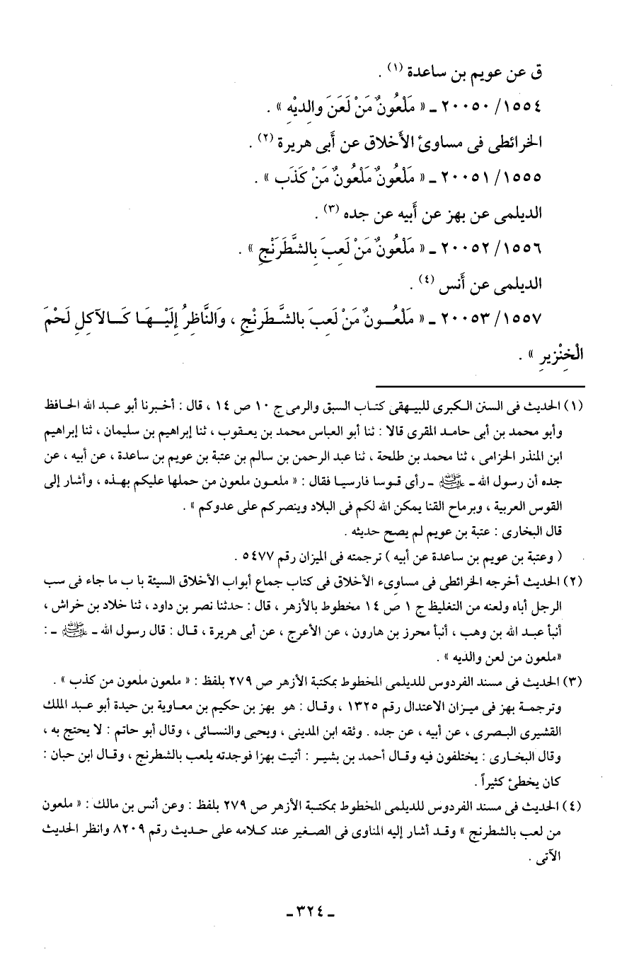 (¬4) الحديث في مسند الفردوس للديلمى المخطوط بمكتبة الأزهر ص 279 بلفظ: وعن أنس بن مالك: "ملعون من لعب بالشطرنج" وقد أشار إليه المناوي في الصغير عند كلامه على حديث رقم 8209 وانظر الحديث الآتي.