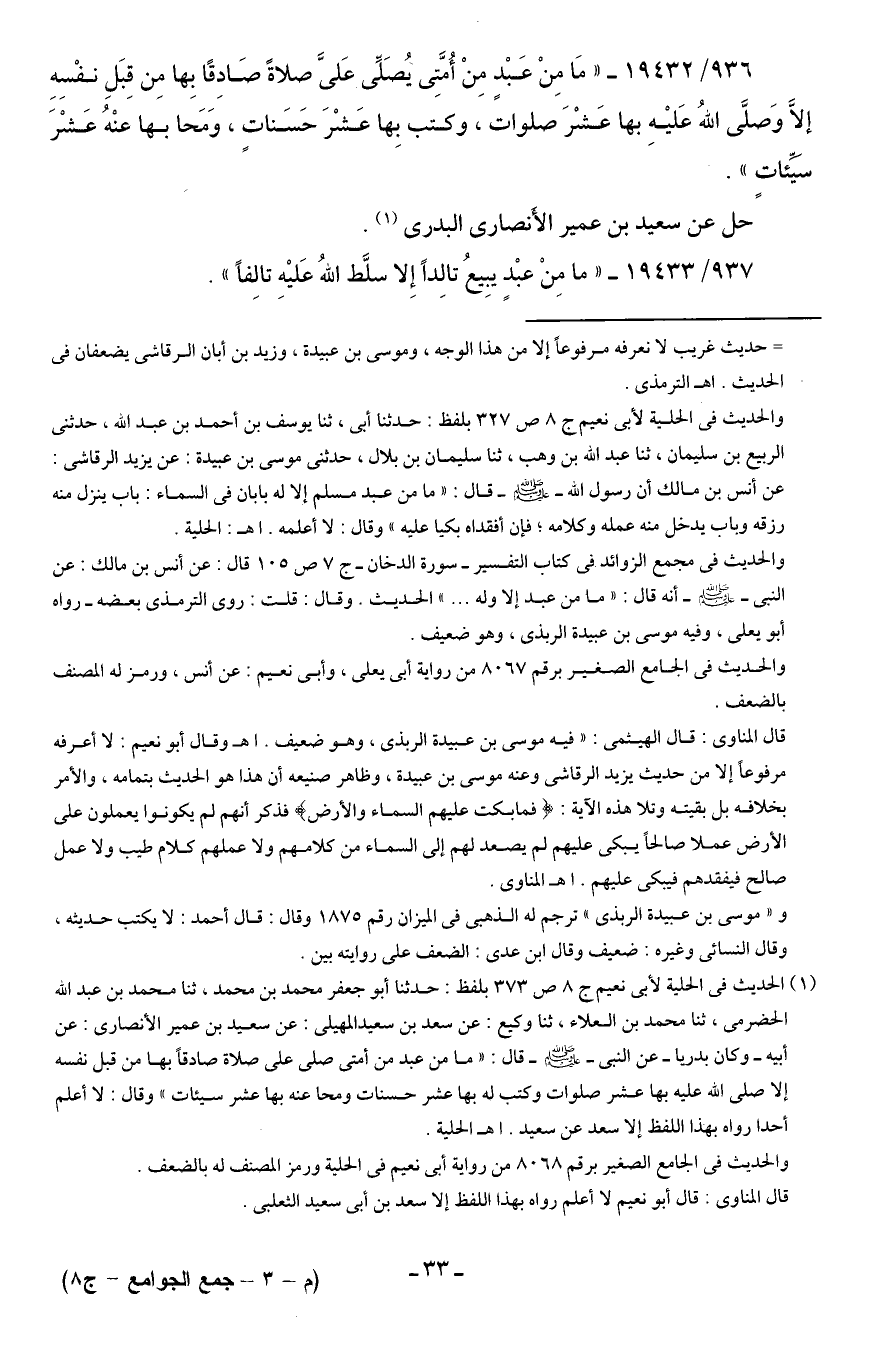 (¬1) الحديث في الحلية لأبي نعيم ج 8 ص 373 بلفظ: حدثنا أبو جعفر محمد بن محمد، ثنا محمد بن عبد الله الحضرمي، ثنا محمد بن العلاء، ثنا وكيع: عن سعد بن سعيد المهيلي: عن سعيد بن عمير الأنصاري: عن أبيه -وكان بدريا- عن النبي - صلى الله عليه وسلم - قال: "ما من عبد من أمتي صلي علي صلاة صادقًا بها من قبل نفسه إلا صلي الله عليه بها عشر صلوات وكتب له بها عشر حسنات ومحا عنه بها عشر سيئات" وقال: لا أعلم أحدا رواه بهذا اللفظ إلا سعد عن سعيد. اهـ الحلية.