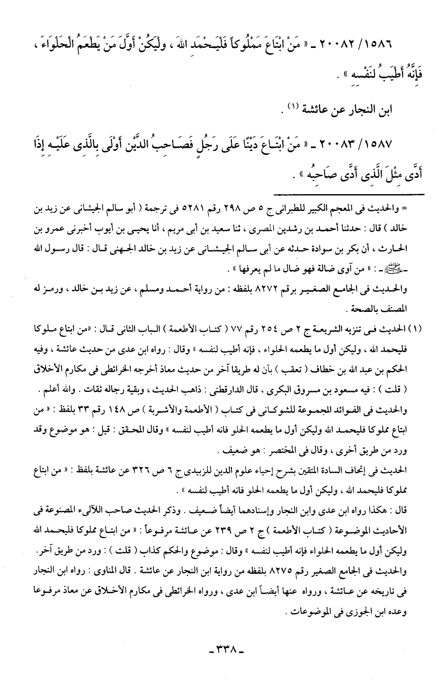 1586/ 20082 - "مَنْ ابْتَاعَ مَمْلُوكًا فَليَحْمَدِ اللهَ، ولْيَكُنْ أَوَّلَ مَنْ يَطْعَمُ الْحَلْوَاءَ، فَإِنَّهُ أَطْيَبُ لنَفْسِهِ".