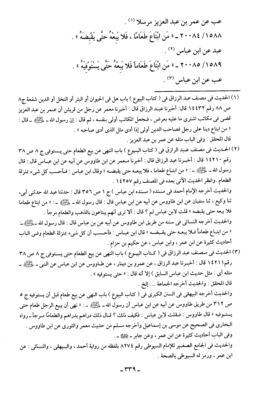 (¬2) الحديث في مصنف عبد الرازق في (كتاب البيوع) باب النهي عن بيع الطعام حتى يستوفى ج 8 ص 38 رقم 14210 قال: أخبرنا عبد الرزاق قال: أخبرنا معمر عن ابن طاووس عن أبيه عن ابن عباس قال: قال رسول الله - صلى الله عليه وسلم -: "من ابتاع طعاما، فلا يبعه حتى يقبضه" وقال ابن عباس: فأحسب كل شيء بمنزلة الطعام. وانظر الحديث الآتي بعده في المصنف رقم 14257.