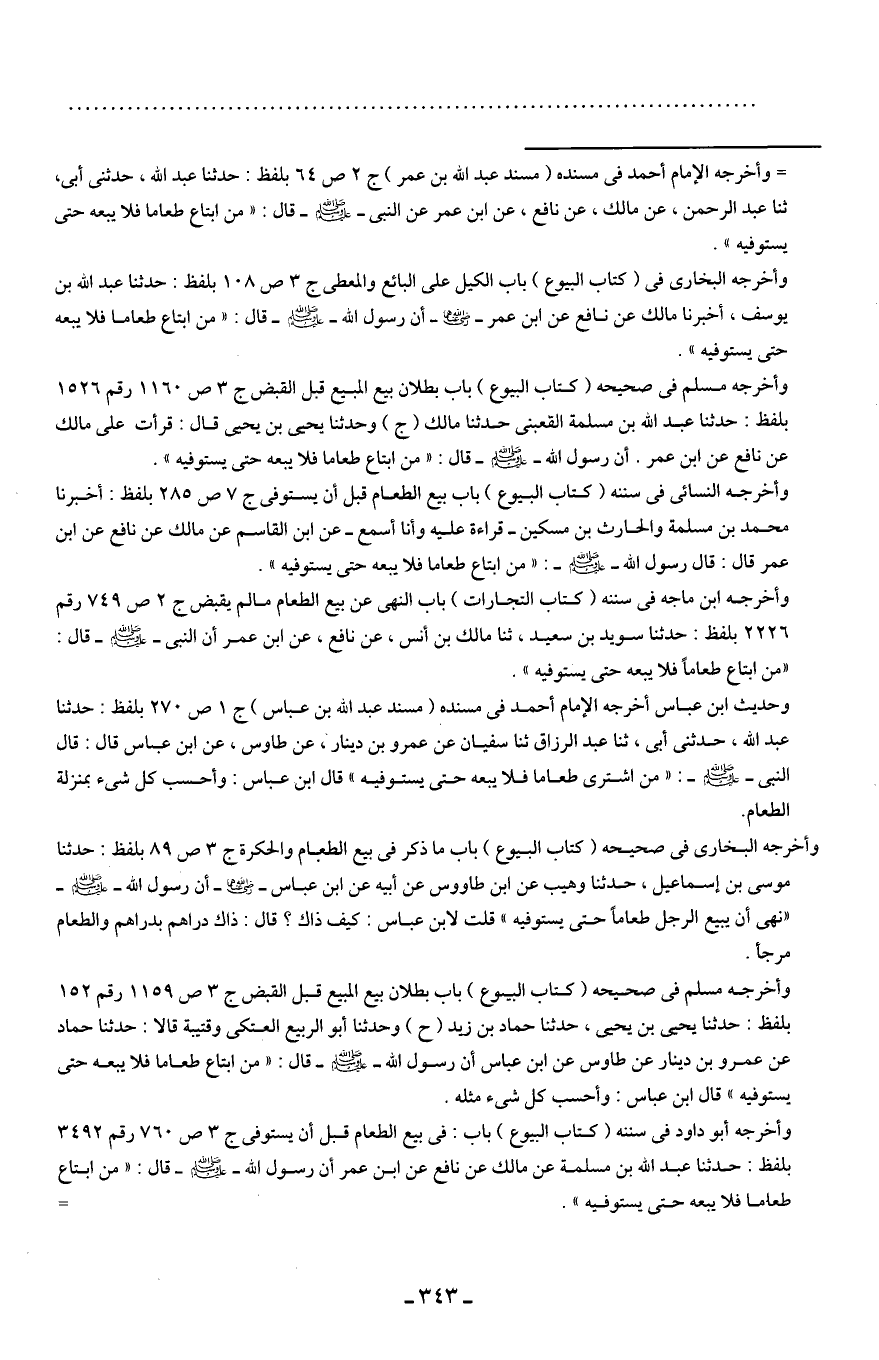 وحديث ابن عباس أخرجه الإمام أحمد في مسنده (مسند عبد الله بن عباس) ج 1 ص 270 بلفظ: حدثنا عبد الله، حدثني أبي، ثنا عبد الرزاق ثنا سفيان عن عمرو بن دينار، عن طاوس، عن ابن بماس قال: قال النبي - صلى الله عليه وسلم -: "من اشترى طعاما فلا يبعه حتى يستوفيه" قال ابن عباس: وأحسب كل شيء بمنزلة الطعام.