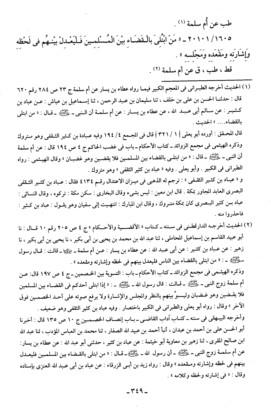 (¬2) الحديث أخرجه الدارقطني في سننه-كتاب "الأقضية والأحكام"ج 4 ص 205 رقم 10 قال: نا أبو عبيد القاسم بن إسماعيل المحاملى، ثنا عبد الله بن محمد بن يحيى بن أبي بكير، نا يحيى بن أبي بكير، نا زهير: عن عاد بن كثير: عن أبي عبد الله: عن عطاء بن يسار: عن أم سلمة - رضي الله عنها - قالت: قال رسول - صلى الله عليه وسلم -: "من ابتلى بالقضاء بين الناس فليعدل بينهم في لحظه وإشارته ومقعده".