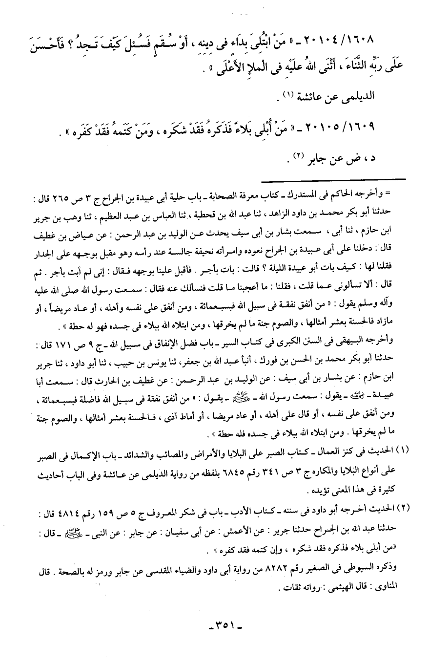 1608/ 20104 - "مَنْ ابْتُلِى بدَاء في دِينِهِ، أَوْ سُقَمٍ فَسُئِلَ كيفَ تَجِدُ؟ فَأحسَنَ عَلَى رَبِّهِ الثَّنَاءَ، أَثْنَى اللهُ علَيهِ في الملإِ الأَعلَى".
