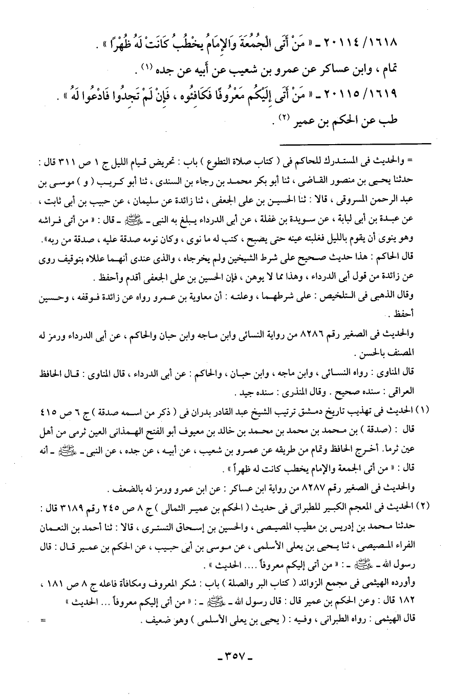 (¬1) الحديث في تهذيب تاريخ دمشق ترتيب الشيخ عبد القادر بدران في (ذكر من اسمه صدقة) ج 6 ص 415 قال: (صدقة) بن محمد بن محمد بن محمد بن خالد بن معيوف أبو الفتح الهمذانى العين ثرمى من أهل عين ثرما. أخرج الحافظ وتمام من طريقه عن عمرو بن شعيب، عن أبيه، عن جده، عن النبي - صلى الله عليه وسلم - أنه قال: "من أتى الجمعة والإمام يخطب كانت له ظهرًا".