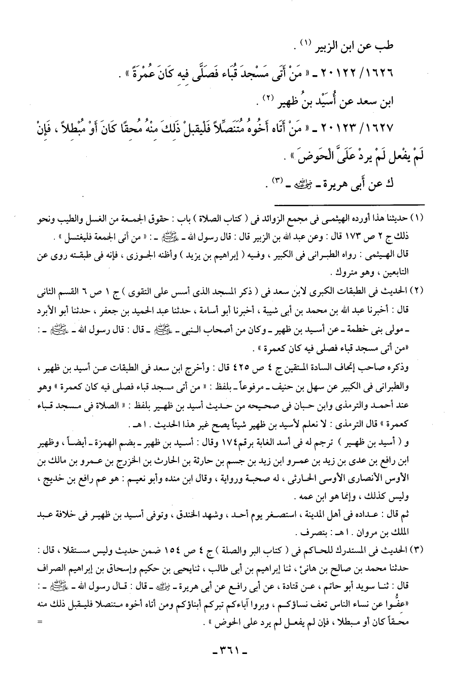(¬2) الحديث في الطبقات الكبرى لابن سعد في (ذكر المسجد الذي أسس على التقوى) ج 1 ص 6 القسم الثاني قال: أخبرنا عبد الله بن محمد بن أبي شيبة، أخبرنا أبو أسامة، حدثنا عبد الحميد بن جعفر، حدثنا أبو الأبرد -مولى بنى خطمة- عن أسيد بن ظهير- وكان من أصحاب النبي - صلى الله عليه وسلم - قال: قال رسول الله - صلى الله عليه وسلم: "من أتى مسجد قباء فصلى فيه كان كعمرة".