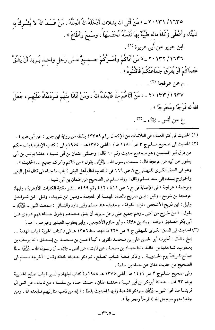 (¬2) الحديث في صحيح مسلم ج 3 ص 1480 ط / الحلبى 1375 هـ-1955 م في (كتاب الإمارة) باب حكم من فرق أمر المسلمين وهو مجتمع حديث رقم 60 قال: وحدثني عثمان بن أبي شيبة، حدثنا يونس بن أبي يعفور عن أبيه عن عرفجة قال: سمعت رسول الله - صلى الله عليه وسلم - يقول "من أتاكم وأمركم جميع ... الحديث".
