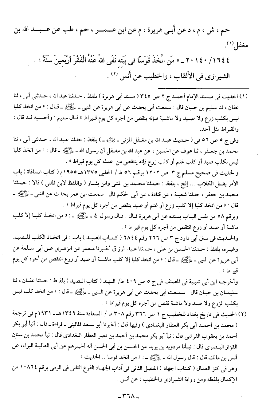 (¬1) الحديث في مسند الإمام أحمد ج 2 ص 345 (مسند أبي هريرة) بلفظ: حدثنا عبد الله، حدثني أبي، ثنا عفان، ثنا سليم بن حبان قال: سمعت أبي يحدث عن أبي هريرة عن النبي - صلى الله عليه وسلم - قال: "من اتخذ كلبا ليس بكلب زرع ولا صيد ولا ماشية فإنه ينقص من أجره كل يوم قيراط" قال سليم: وأحسبه قد قال: والقيراط مثل أحد.