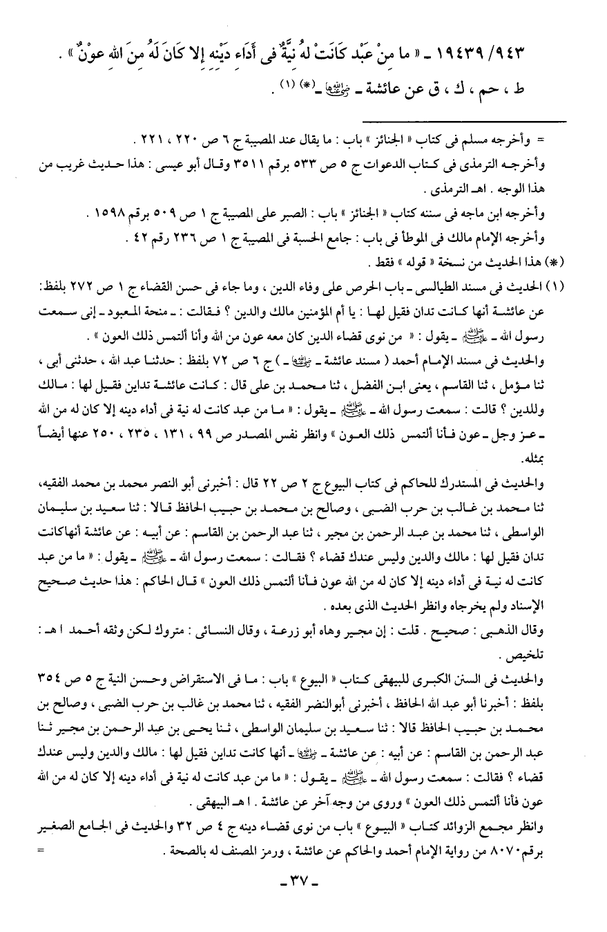 943/ 19439 - "ما مِنْ عَبْد كَانَتْ لهُ نِيَّةٌ وفي أَدَاءِ دَينِهِ إِلا كَانَ لَهُ مِنَ اللهِ عوْنٌ".