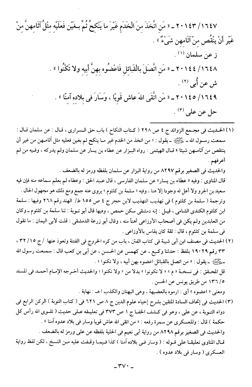 1647/ 20143 - "مَنِ اتَّخَذَ مِنَ الْخَدَمِ غَيرَ ما يَنْكِحُ ثُمَّ بغَين فَعَلَيهِ مِثْلُ آثَامِهنَّ مِنْ غَير أَنْ ينْقُص مِنْ آثَامِهِن شَيْءٌ".