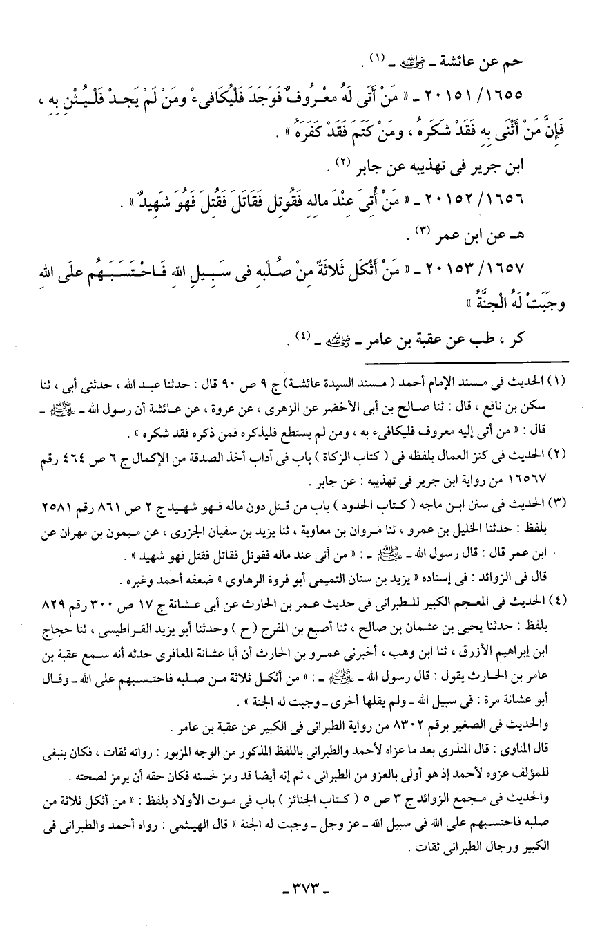 1657/ 20153 - "مَنْ أَثْكَل ثَلاثَةً مِنْ صُلْبهِ في سَبِيلِ اللهِ فَاحْتَسَبَهُم علَى اللهِ وجَبَتْ لَهُ الْجنَّةُ".