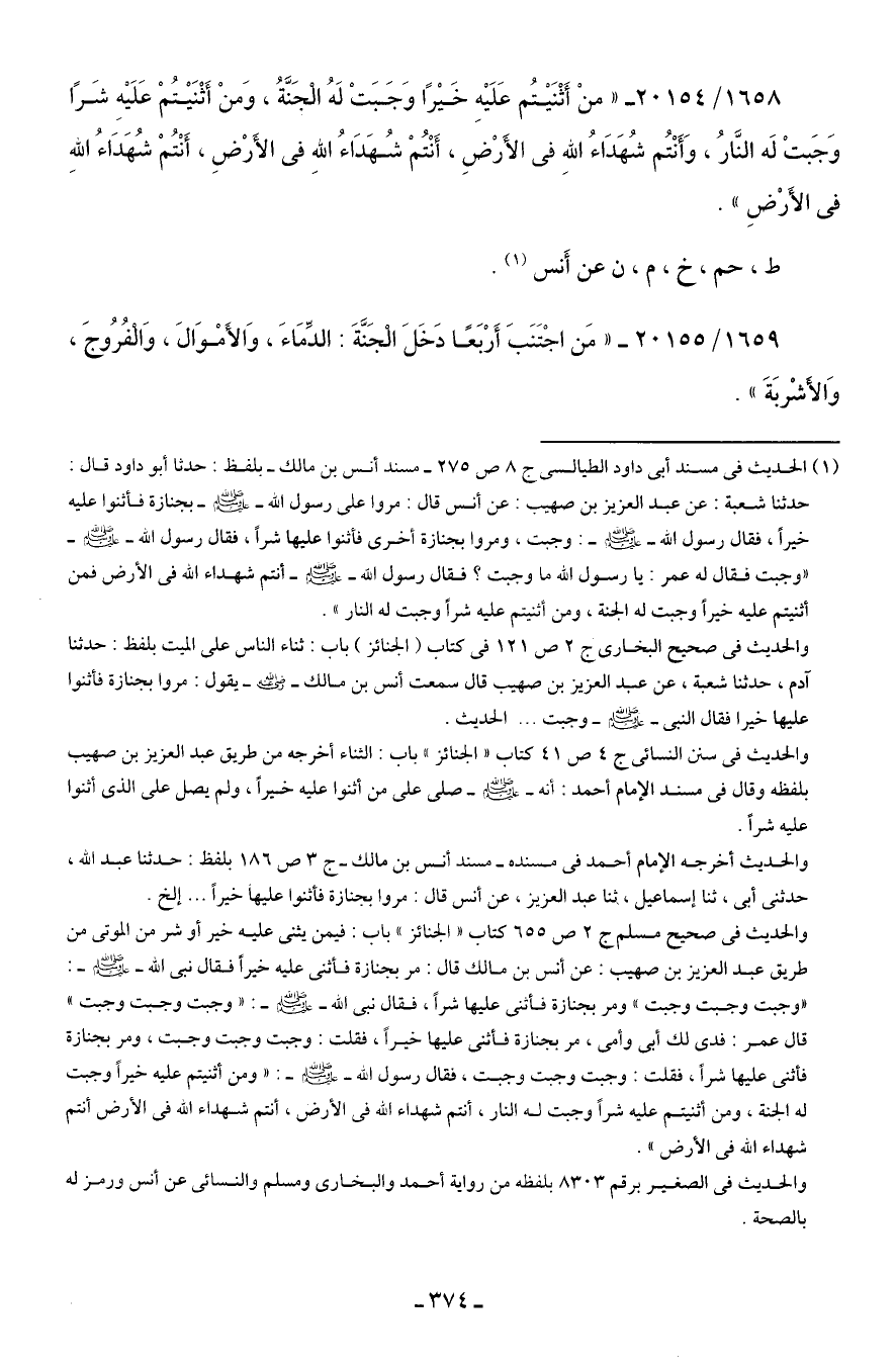 1658/ 20154 - "منْ أَثْنَيتُم عَلَيهِ خَيرًا وَجَبَتْ لَهُ الْجَنَّةُ، وَمنْ أَثْنَيتُمْ عَلَيهِ شَرًا وَجَبتْ لَه النَّارُ، وَأَنْتُم شُهَدَاءُ اللهِ في الأَرْضِ، أَنْتُمْ شُهَدَاءُ اللهِ في الأَرْضِ، أَنْتُمْ شُهَدَاءُ اللهِ في الأَرْضِ".
