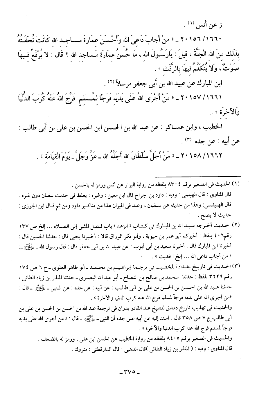 1660/ 20156 - "منْ أَجابَ دَاعِى اللهِ وَأَحْسَنَ عِمَارةَ مساجِدِ اللهِ كَانَتْ تُحْفَتُهُ بِذَلِك منَ اللهِ الْجَنَّةَ، قِيلَ: يَارَسُولَ اللهِ، مَا حُسنُ عِمَارَةِ مَساجِدِ اللهِ؟ قَال: لا يُرْفَعُ فِيهَا صَوْتٌ، وَلا يُتَكَلَّمُ فِيهَا بِالرَّفَثِ".
