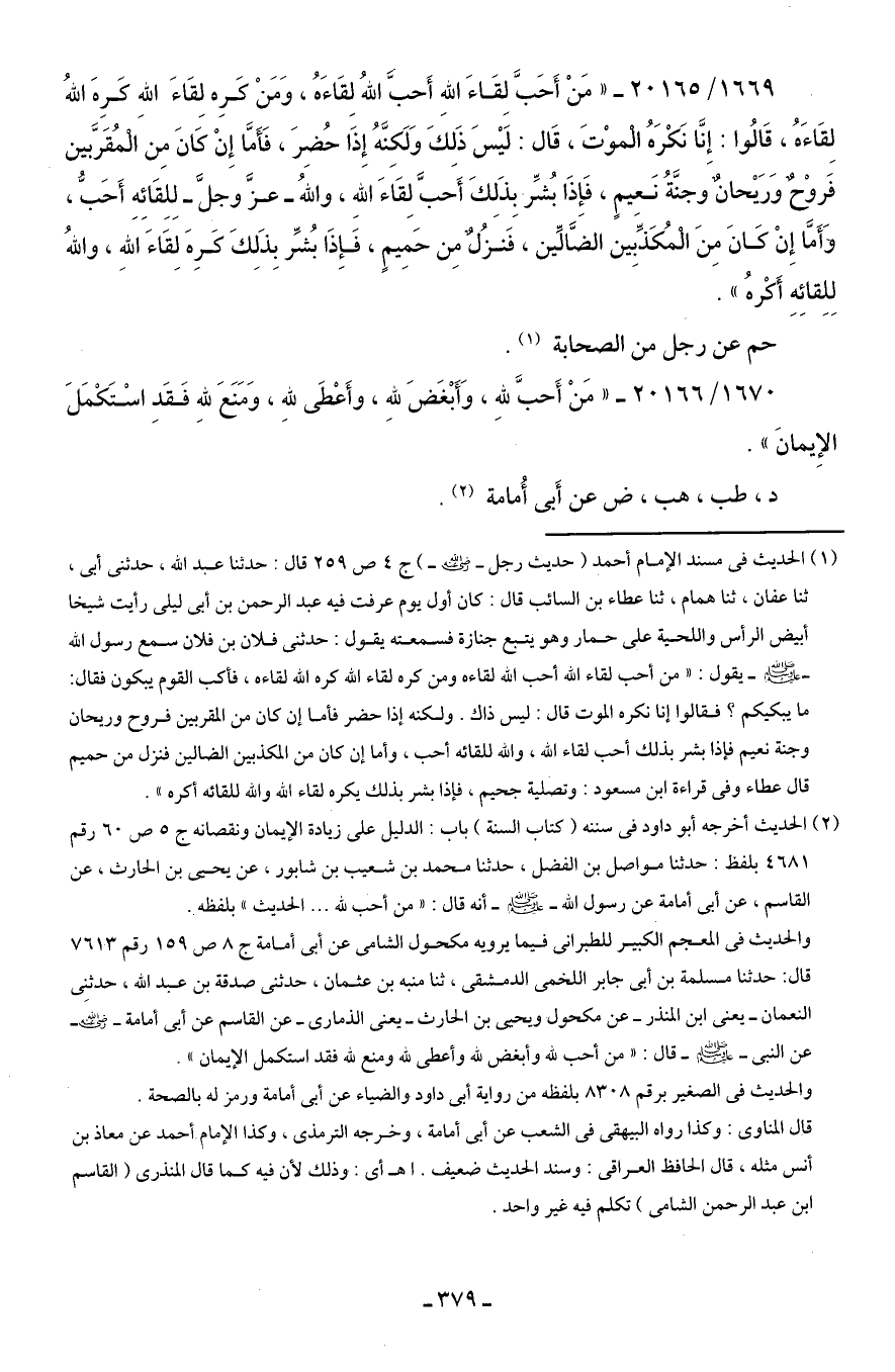 1669/ 20165 - "مَنْ أَحَبَّ لِقَاءَ اللهِ أَحبَّ اللهُ لِقَاءَهُ، وَمَنْ كَرِه لِقَاءَ اللهِ كَرِهَ اللهُ لِقَاءَهُ، قَالُوا: إِنَّا نَكْرَهُ الْموْتَ، قَال: لَيسَ ذَلِكَ وَلَكِنَّهُ إِذَا حُضِرَ، فَأَمَّا إِنْ كَانَ مِن الْمُقَرَّبين فَروحٌ وَرَيحانٌ وجنَّةُ نَعيمٍ، فَإِذَا بُشِّر بِذَلِكَ أَحبَّ لِقَاءَ اللهِ، واللهُ - عزَّ وجلَّ - لِلِقَائِهِ أَحَبُّ، وَأَمَّا إِنْ كَانَ مِنَ الْمُكَذِّبين الضَّالِّين، فَنزُلٌ مِن حَمِيمٍ، فَإِذَا بُشِّر بِذَلِكَ كَرِهَ لِقَاءَ اللهِ، واللهُ لِلِقائِهِ أَكْرهُ".