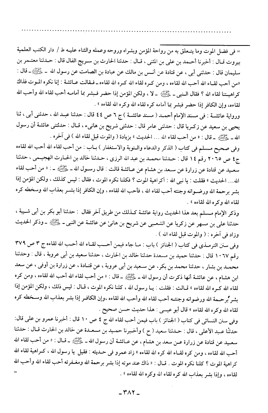 وفي سنن الترمذي في كتاب (الجنائز) باب: ما جاء فيمن أحب لقاء الله أحب الله لقاءه ج 3 ص 379 رقم 1067 قال: حدثنا حميد بن مسعدة حدثنا خالد بن الحارث، حدثنا سعيد بن أبي عروبة، قال: وحدثنا محمد بن بشار، حدثنا محمد بن بكر، عن سعيد بن أبي عروبة، عن قتادة، عن زرارة بن أوفى، عن سعد بن هشام، عن عائشة أنها ذكرت أن رسول الله - صلى الله عليه وسلم - قال: "من أحب لقاء الله أحب الله لقاءه، ومن كره لقاء الله كره الله لقاءه" قالت: فقلت: يا رسول الله، كلنا نكره الموت، قال: ليس ذلك، ولكن المؤمن إذا بشر برحمة الله ورضوانه وجنته أحب لقاء الله وأحب الله لقاءه، وإن الكافر إذا بشر بعذاب الله وسخطه كره لقاء الله وكره الله لقاءه" قال أبو عيسى: هذا حديث حسن صحيح.