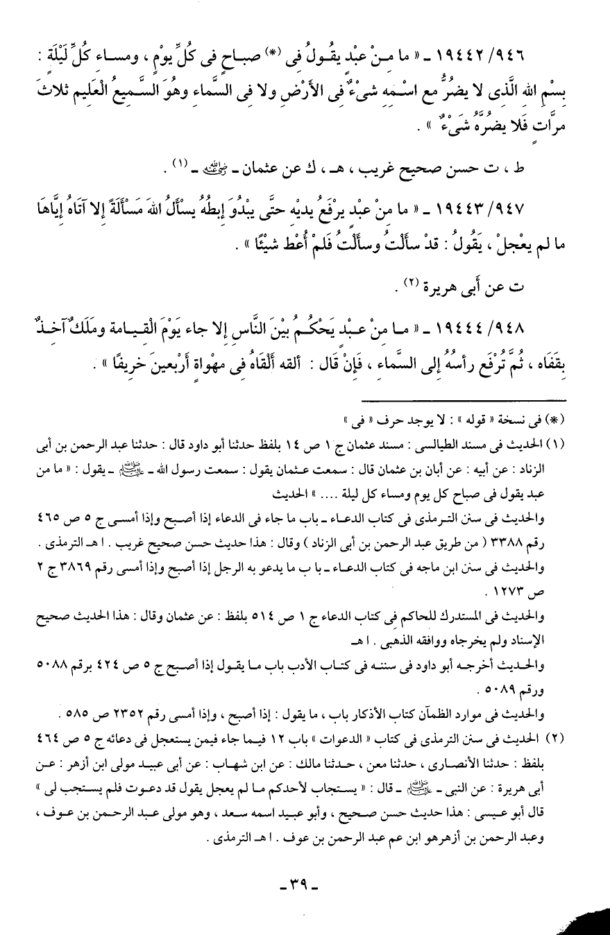 (¬1) الحديث في مسند الطيالسي: مسند عثمان ج 1 ص 14 بلفظ حدثنا أبو داود قال: حدثنا عبد الرحمن بن أبي الزناد: عن أبيه: عن أبان بن عثمان قال: سمعت عثمان يقول: سمعت رسول الله - صلى الله عليه وسلم - يقول: "ما من عبد يقول في صباح كل يوم ومساء كل ليلة. " الحديث