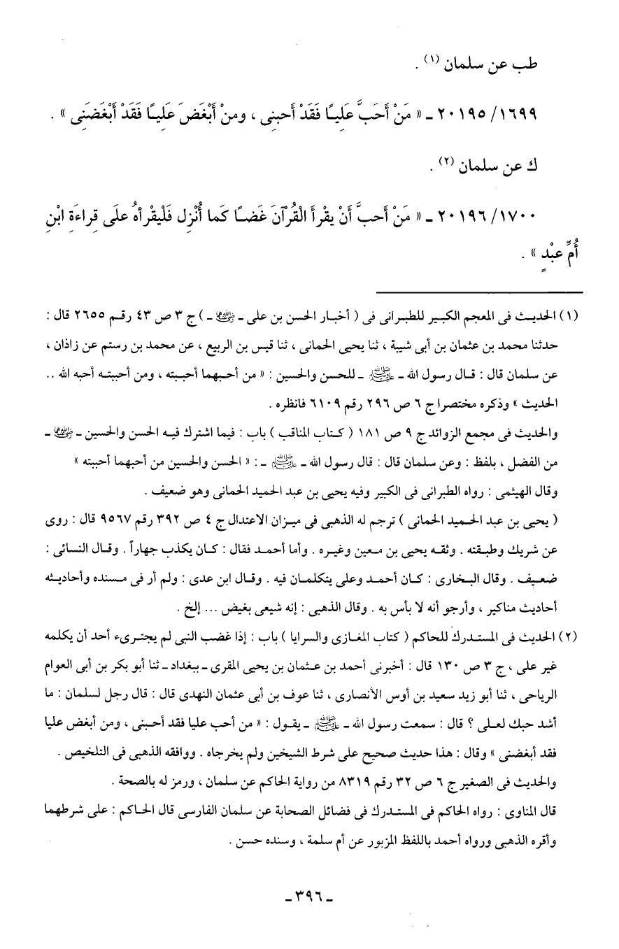 (¬2) الحديث في المستدرك للحاكم (كتاب المغازي والسرايا) باب: إذا غضب النبي لم يجترئ أحد أن يكلمه غير على، ج 3 ص 130 قال: أخبرني أحمد بن عثمان بن يحيى المقرى -ببغداد- حدثنا أبو بكر بن أبي العوام الرياحى، حدثنا أبو زيد سعيد بن أوس الأنصاري، حدثنا عوف بن أبي عثمان النهدى قال: قال رجل لسلمان: ما أشد حبك لعلى؟ قال: سمعت رسول - صلى الله عليه وسلم - يقول: "من أحب عليا فقد أحبنى، ومن أبغض عليا فقد أبغضنى" وقال: هذا حديث صحيح على شرط الشيخين ولم يخرجاه. ووافقه الذهبي في التلخيص.