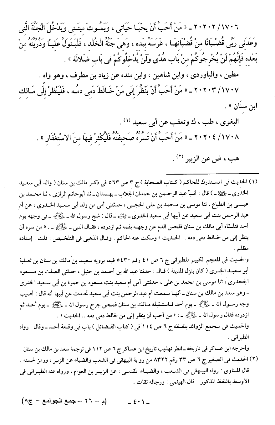 (¬1) الحديث في المستدرك للحاكم (كتاب الصحابة) ج 3 ص 563 في ذكر مالك بن سنان (والد أَبى سعيد الخدري - رضي الله عنه -) قال: أنبأ عبد الرحمن بن حمدان الجلاب -بهمدان- ثنا أبو حاتم الرازي، ثنا محمد بن عيسى بن الطباع، ثنا موسى بن محمد بن علي الحجبى، حدثتني أمى من ولد أَبى سعيد الخدري، عن أم عبد الرحمن بنت أَبى سعيد عن أبيها أَبى سعيد الخدري - رضي الله عنه - قال: شج رسول الله - صلى الله عليه وسلم - في وجهه يوم أحد فتلقاه أَبى مالك بن سنان فلحس الدم عن وجهه بفمه ثم ازدرده، فقال النبي - صلى الله عليه وسلم -: "من سره أن ينظر إلى من خالط دمى دمه .. الحديث" وسكت عنه الحاكم. وقال الذهبي في التلخيص: قلت: إسناده مظلم.