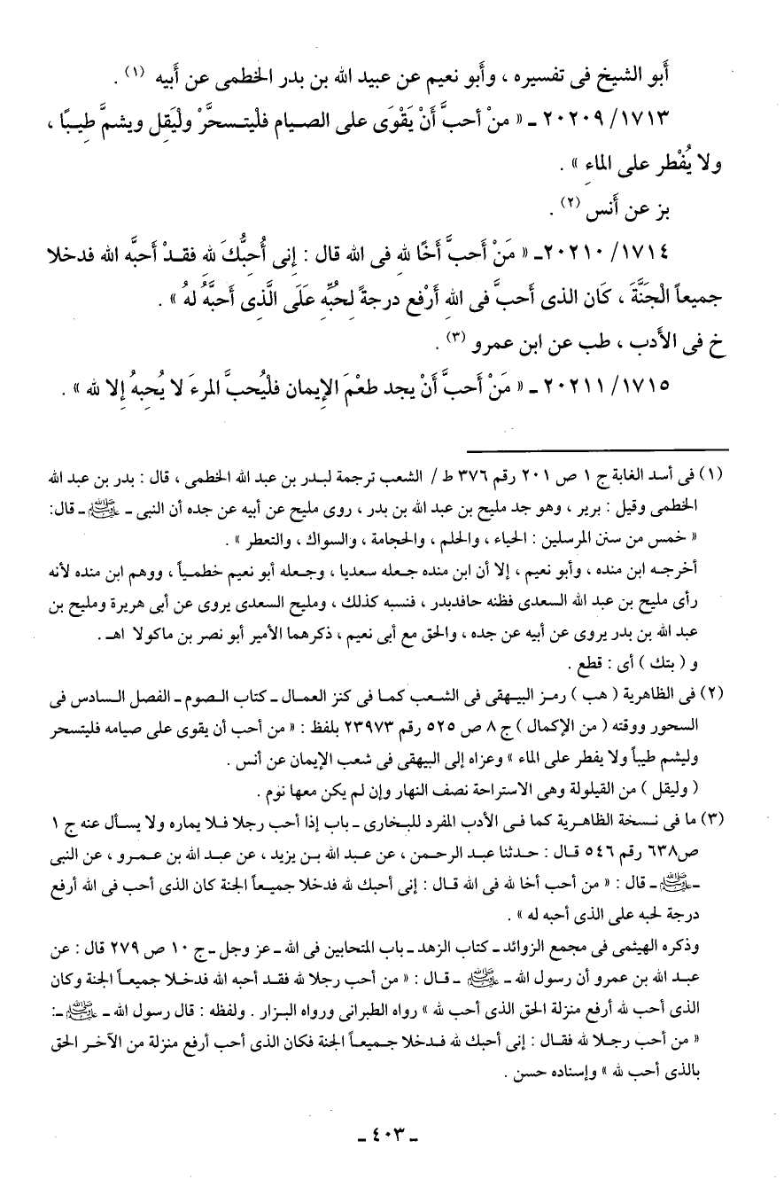 1714/ 20210 - "مَنْ أَحبَّ أَخًا للهِ في الله قال: إِنى أُحِبُّكَ للهِ فقدْ أَحبَّه الله فدخلا جميعًا الْجَنَّةَ، كَان الذي أَحبَّ في الله أَرْفع درجةً لِحُبِّهِ عَلَى الَّذِي أَحبَّهُ لهُ".