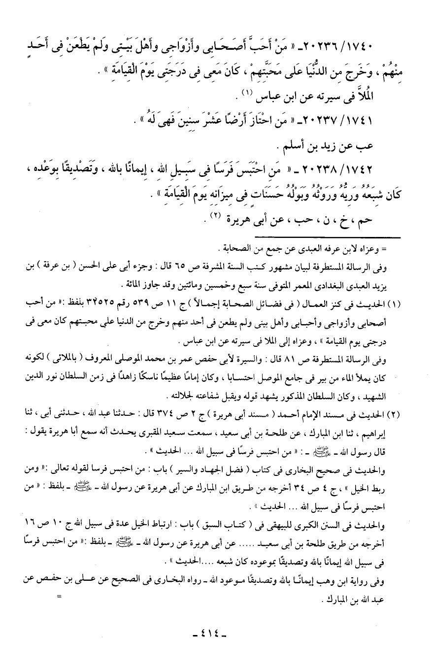 (¬2) الحديث في مسند الإمام أحمد (مسند أَبى هريرة) ج 2 ص 374 قال: حدثنا عبد الله، حدثني أَبى، ثنا إبراهيم، ثنا ابن المبارك، عن طلحة بن أَبي سعيد، سمعت سعيد المقبرى يحدث أنه سمع أبا هريرة يقول: قال رسول الله - صلى الله عليه وسلم -: "من احتبس فرسًا في سبيل الله ... الحديث".