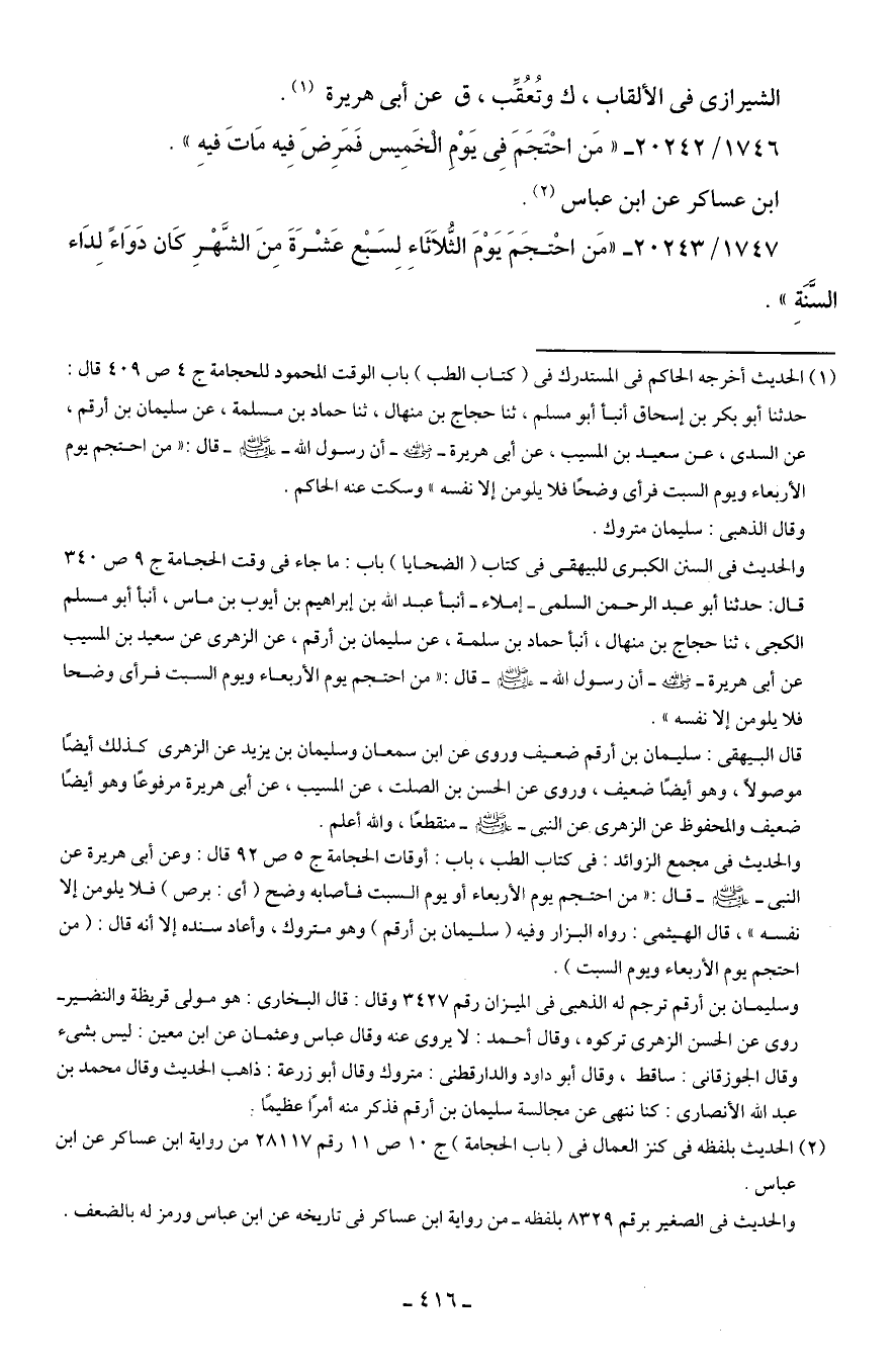 1747/ 20243 - "مَن احْتجَمَ يَوْمَ الثُّلاثَاءِ لِسَبعْ عَشْرَةَ مِنَ الشَّهْرِ كَان دَوَاءً لِدَاء السَّنَةِ".