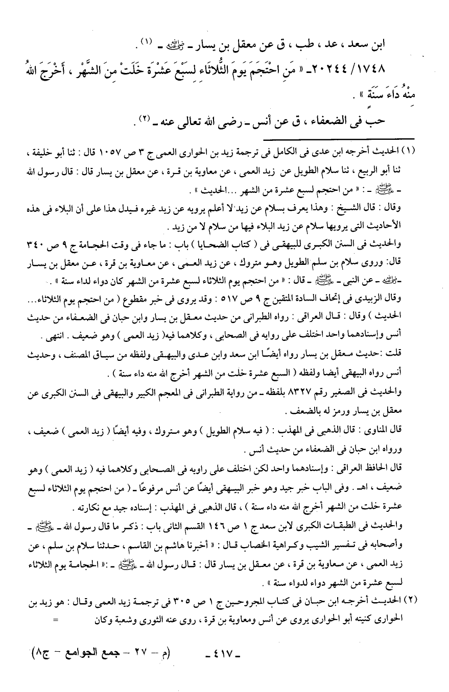 (¬1) الحديث أخرجه ابن عدي في الكامل في ترجمة زيد بن الحوارى العمى ج 3 ص 1057 قال: ثنا أبو خليفة، ثنا أبو الربيع، ثنا سلام الطويل عن زيد العمى، عن معاوية بن قرة، عن معقل بن يسار قال: قال رسول الله - صلى الله عليه وسلم -: "من احتجم لسبع عشرة من الشهر ... الحديث".