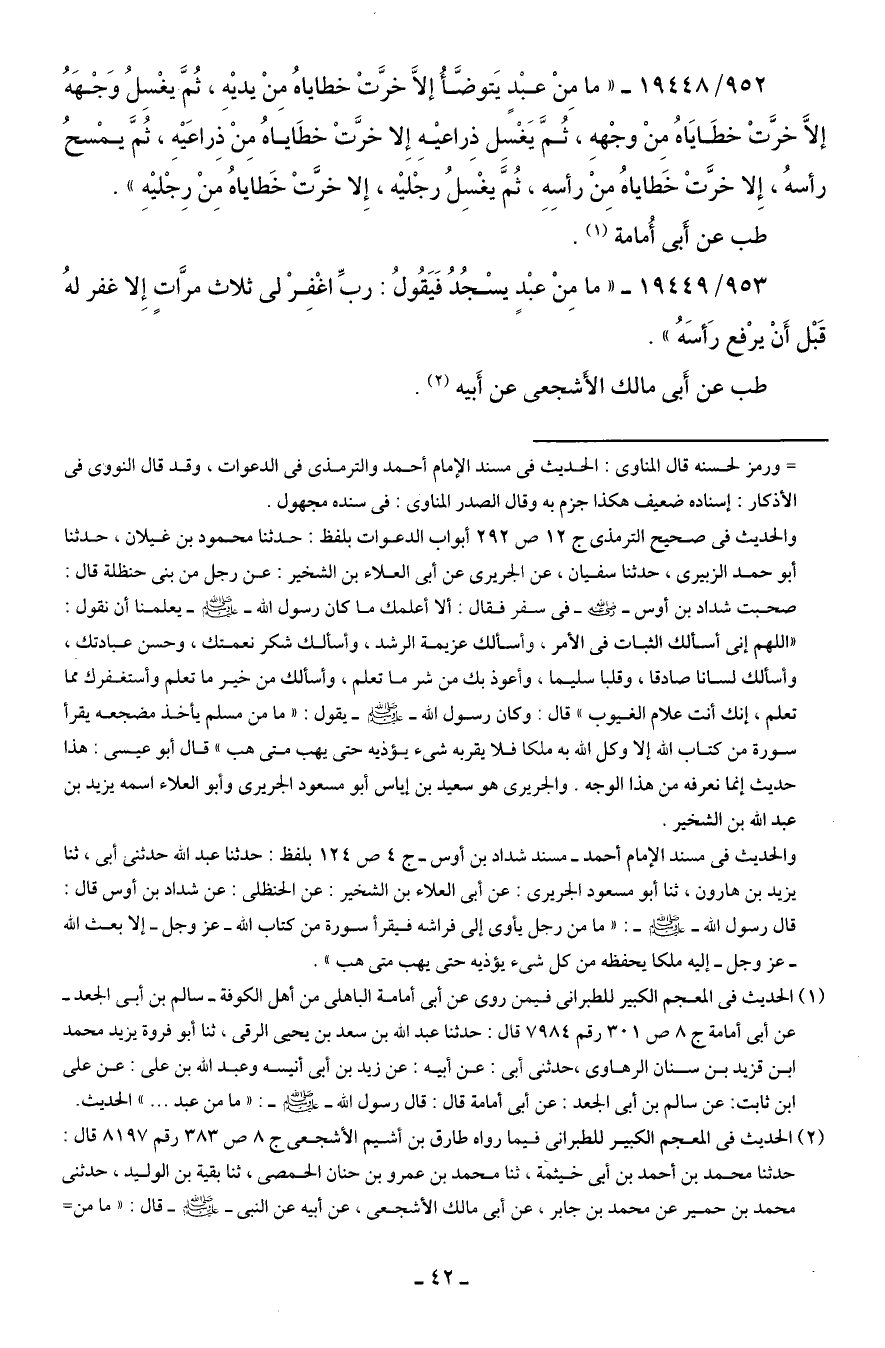 (¬2) الحديث في المعجم الكبير للطبرانى فيما رواه طارق بن أشيم الأشجعى ج 8 ص 383 رقم 8197 قال: حدثنا محمد بن أحمد بن أبي خيثمة، ثنا محمد بن عمرو بن حنان الحمصى، ثنا بقية بن الوليد، حدثني محمد بن حمير عن محمد بن جابر، عن أبي مالك الأشجعى، عن أبيه عن النبي - صلى الله عليه وسلم - قال: "ما من =