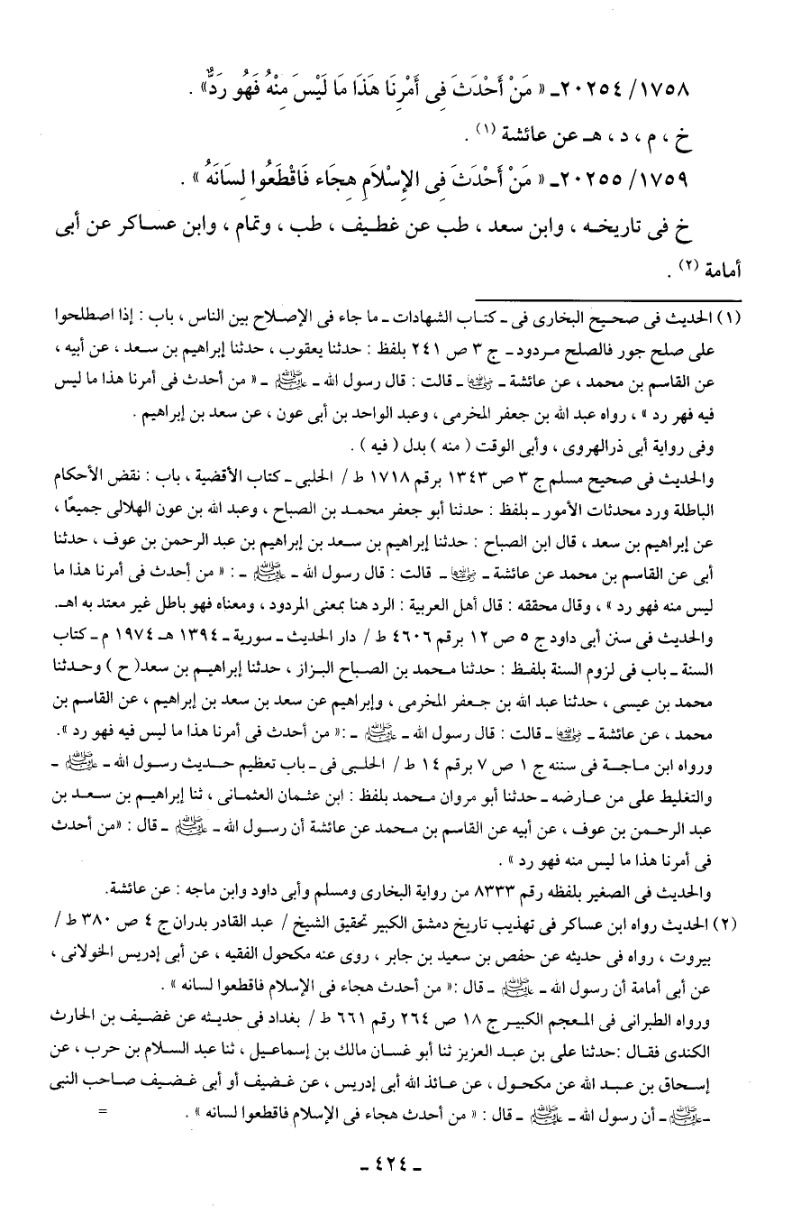 1758/ 20254 - "مَنْ أَحْدَثَ فِي أَمْرِنَا هَذَا مَا لَيسَ مِنْهُ فَهُو رَدٌّ".