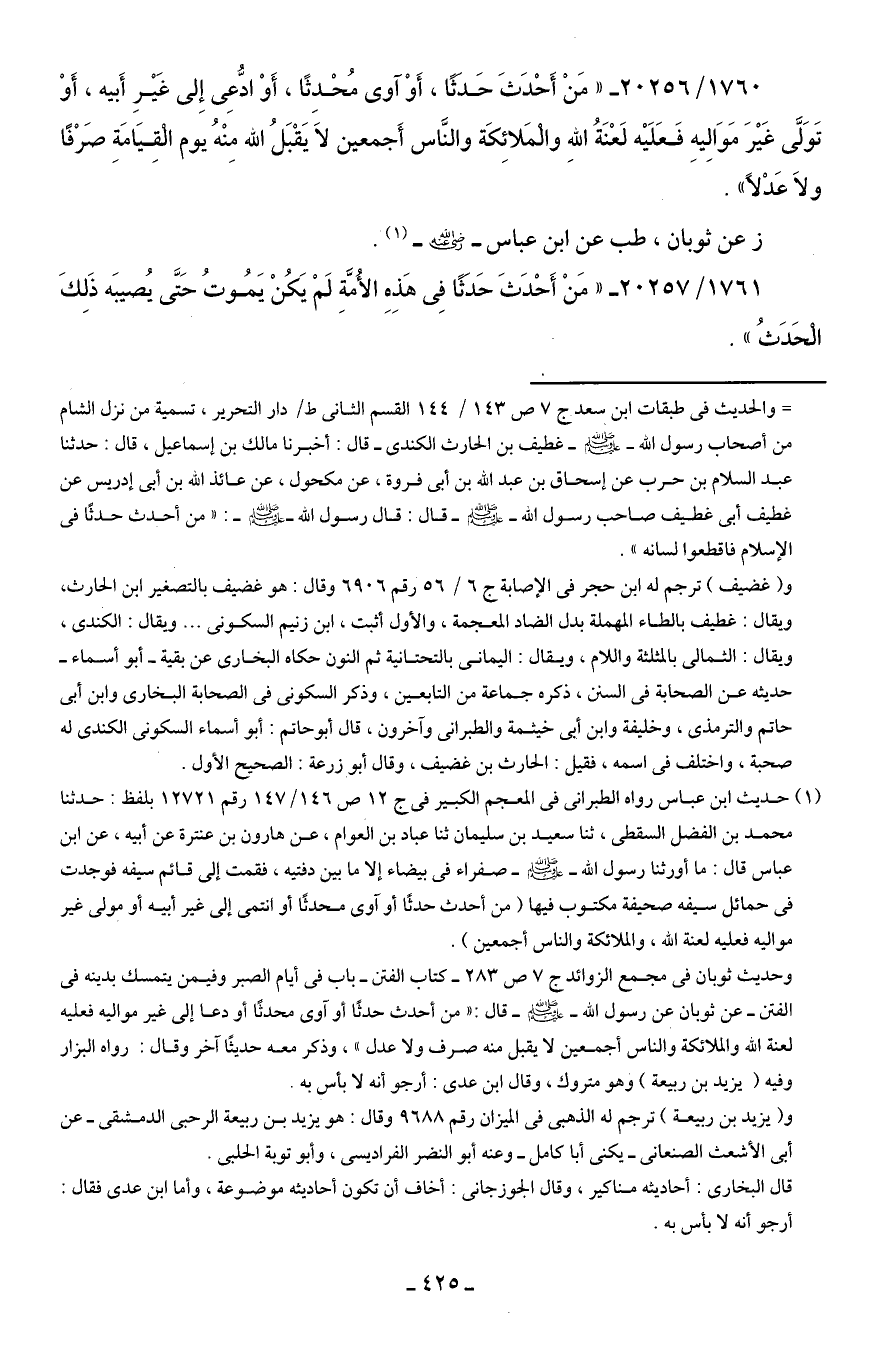 = والحديث في طبقات ابن سعد ج 7 ص 143/ 144 القسم الثاني ط / دار التحرير، تسمية من نزل الشام من أصحاب رسول الله - صلى الله عليه وسلم - غطيف بن الحارث الكندى- قال: أخبرنا مالك بن إسماعيل، قال: حدثنا عبد السلام بن حرب عن إسحاق بن عبد الله بن أَبي فروة، عن مكحول، عن عائذ الله بن أَبي إدريس عن غطيف أَبى غطيف صاحب رسول الله - صلى الله عليه وسلم - قال: قال رسول الله - صلى الله عليه وسلم -: "من أحدث حدثًا في الإسلام فاقطعوا لسانه".
