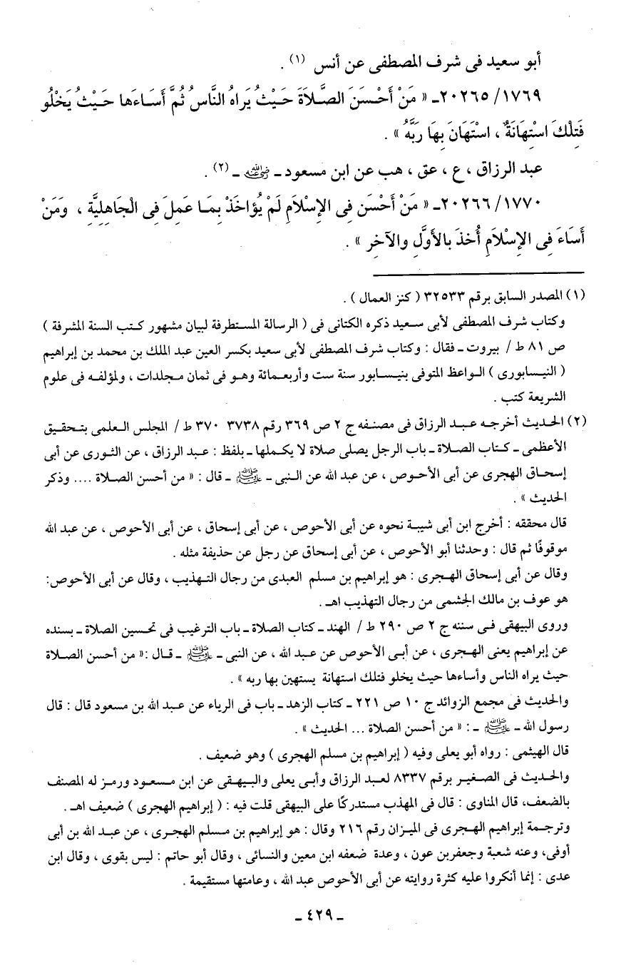 (¬2) الحديث أخرجه عبد الرزاق في مصنفه ج 2 ص 369 رقم 3738 370 ط / المجلس العلمي بتحقيق الأعظمى -كتاب الصلاة- باب الرجل يصلى صلاة لا يكملها- بلفظ: عبد الرزاق، عن الثوري عن أَبي إسحاق الهجرى عن أَبي الأحوص، عن عبد الله عن النبي - صلى الله عليه وسلم - قال: "من أحسن الصلاة ..... وذكر الحديث".