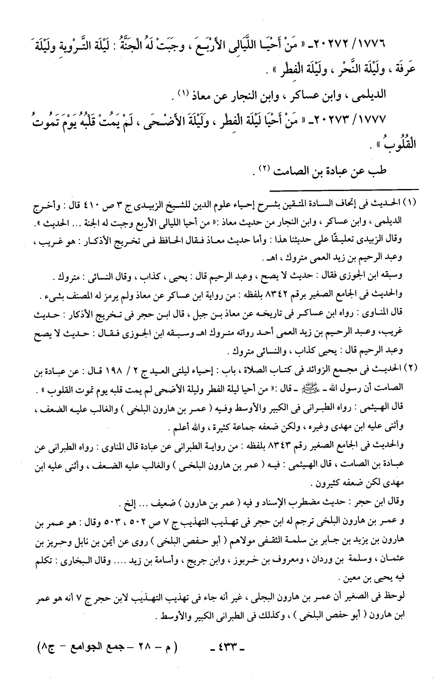 (¬1) الحديث في إتحاف السادة المتقين بشرح إحياء علوم الدين للشيخ الزبيدي ج 3 ص 410 قال: وأخرج الديلمى، وابن عساكر، وابن النجار من حديث معاذ: "من أحيا الليالى الأربع وجبت له الجنة. . . الحديث".