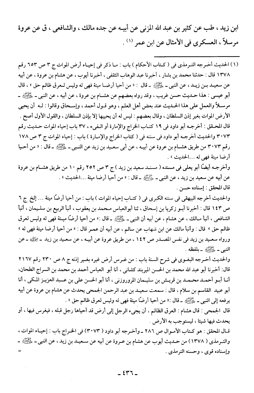 قال المحقق: أخرجه أبو داود في 19 كتاب الخراج والإمارة أو الفئ، 37 باب إحياء الموات حديث رقم 3073 والحديث أخرجه أبو داود في سننه في (كتاب الخراج والإمارة) باب: إحياء الموات ج 3 ص 178 رقم 3073 من طريق هشام بن عروة عن أبيه، عن أبي سعيد بن زيد عن النبي - صلى الله عليه وسلم - قال: "من أحيا أرضا ميتة فهي له. . . الحديث".