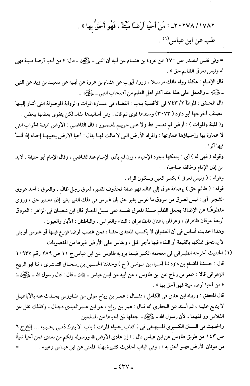 1782/ 20278 - "مَنْ أَحْيَا أَرْضًا ميَتةً، فَهُوَ أَحَقُّ بِها".