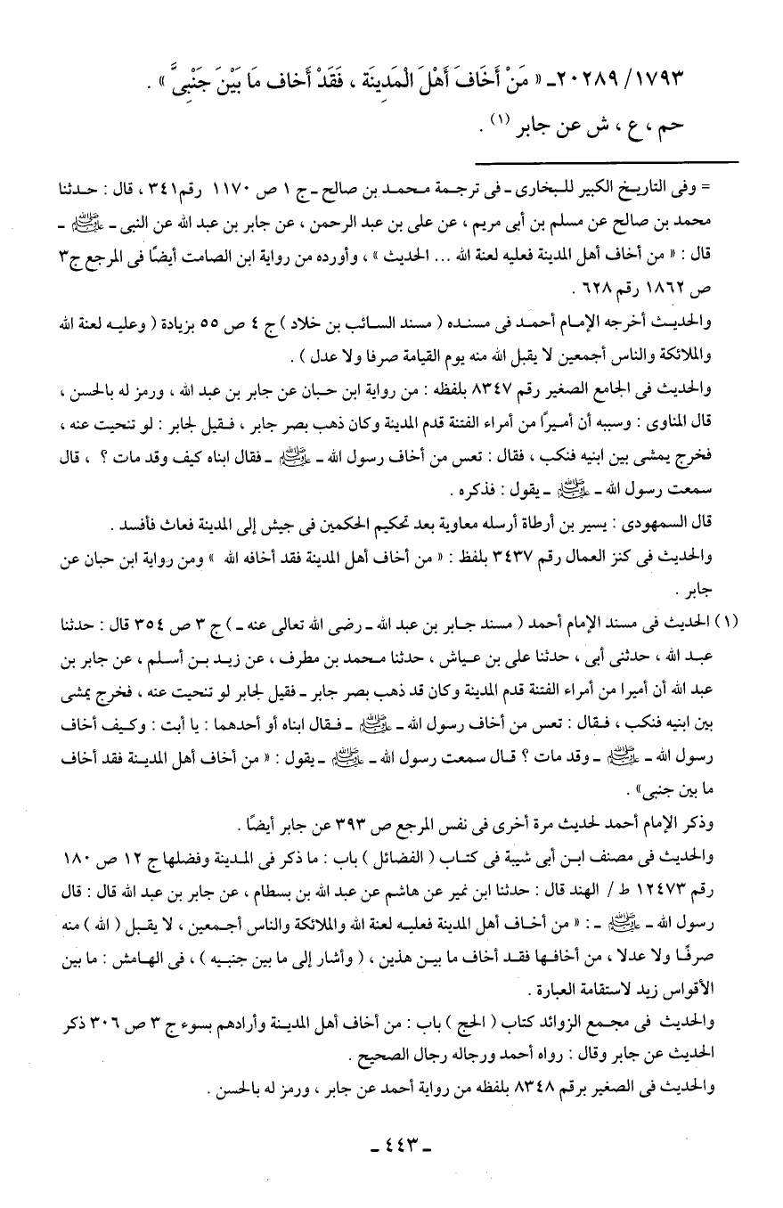 1793/ 20289 - "مَنْ أَخَافَ أَهْلَ الْمَدِينَة، فَقَدْ أَخاف مَا بَينَ جَنْبِيَّ".